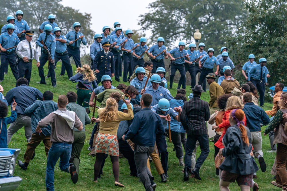 1968 年民主党全国代表大会上的和平抗议演变成了与警察和国民警卫队的暴力冲突。抗议活动的组织者包括艾比·霍夫曼、杰里·鲁宾、汤姆·海登和鲍勃·席勒,他们被指控阴谋煽动暴乱,随之而来的审判是历史上最臭名昭著的几场审判之一。